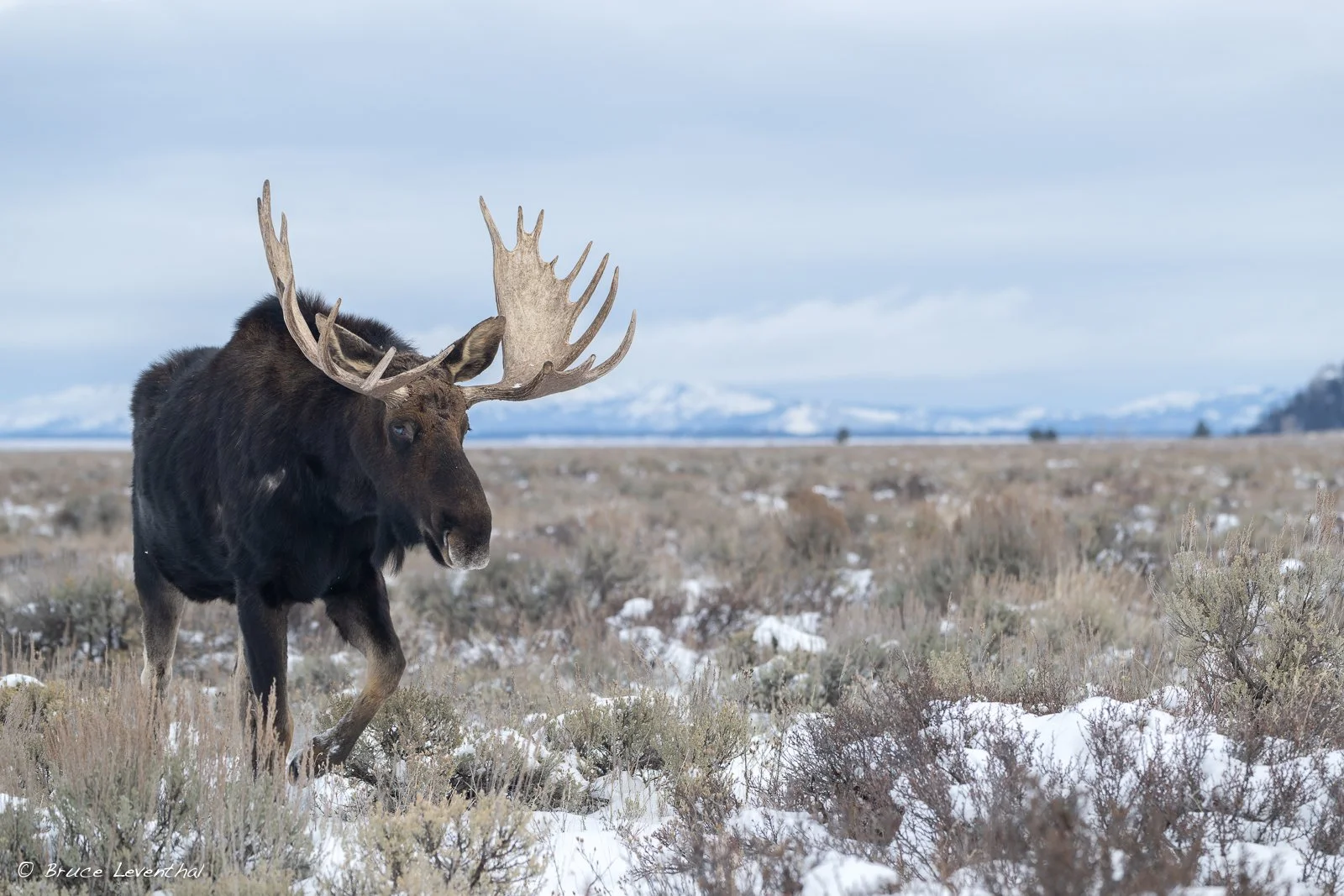 Moose Walking : I took well over a thousand moose photos during my trip to the Tetons and have deleted the set to a collection of one-hundred keepers. While I’m not sure that this is my “best” moose photo, I found this particular experience to be exhilarating. I wanted to make a picture of a moose that was “intimate” and suggested something about its immense size. I scrambled through snow and sage brush to get ahead of this individual, crouched low, and framed the shot to capture a bit of mountains and sky. I felt like a tiny gnome standing among giants.