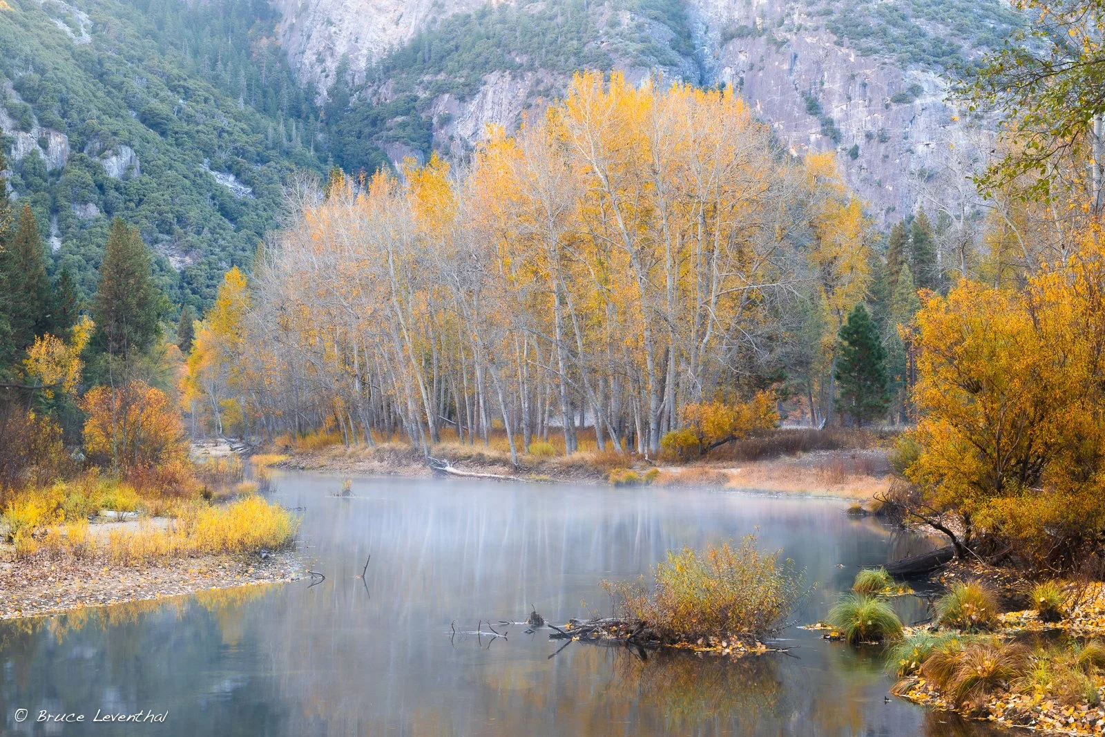 Pastels in Yosemite : I traveled to Yosemite in November to photograph autumn color. On this windless morning there was just a hint of fog as the sun was rising up and behind the mountains. I used a filter to allow for a long exposure with the hope that the rising fog would convey someing a little etherial about the landscape.