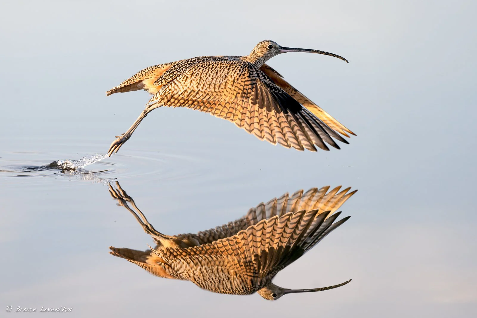 Curlew Curlew : This long-billed curlew was photographed in the Elkhorn Slough near Moss Landing. I live 20 minutes from this ecological reserve and try to visit at least once a week. On this day, the low sun angle of sunrise and still water in the mudflat allowed me to capture a perfect reflection as the bird flew to another nearby location.