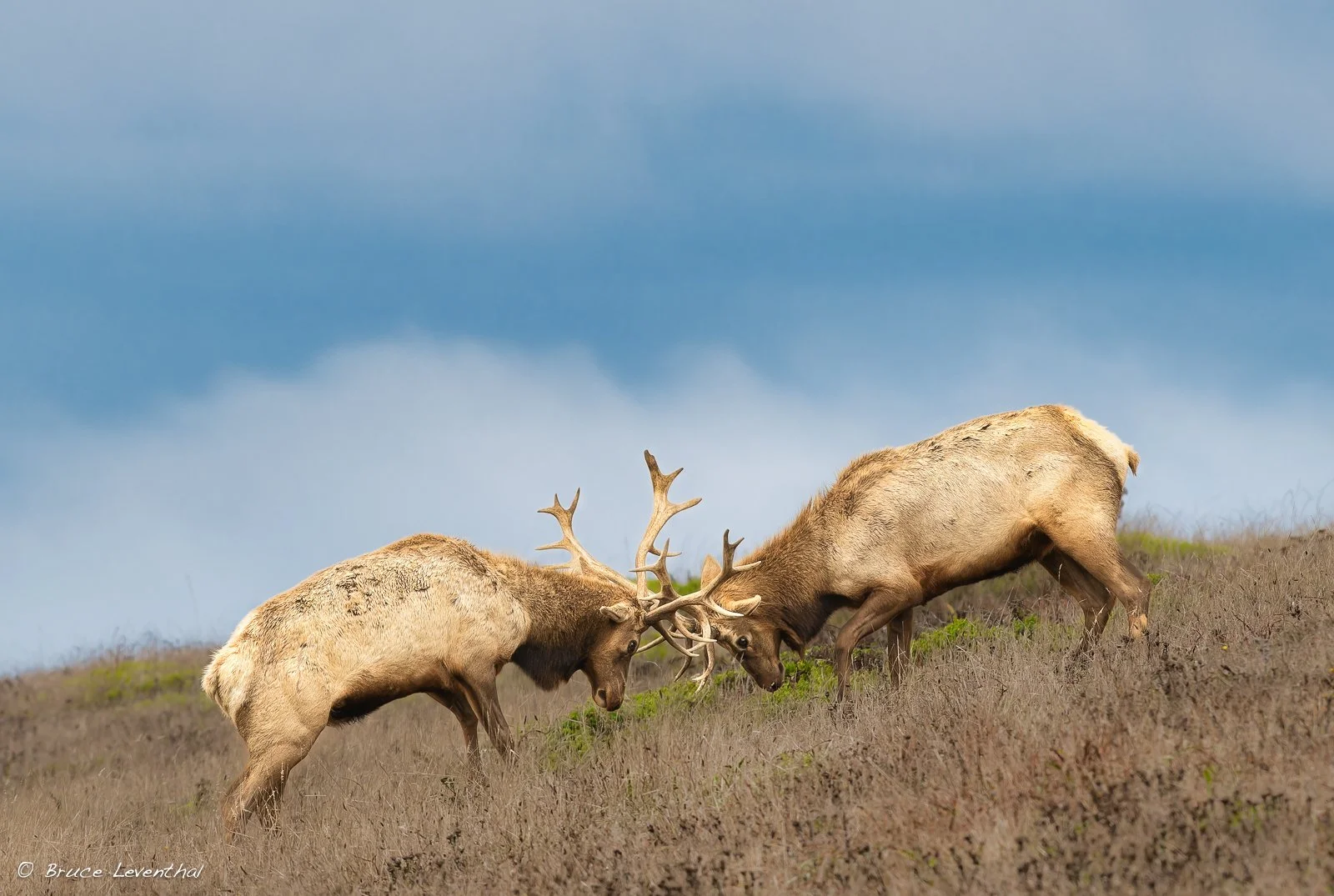 Racked-up : I like to visit Point Reyes National Sea Shore many times throughout the year. I go there often to photograph bobcats and coyotes, but also a plan every September to photograph the elk rut. Last year I saw some magnificent elk in thick fog, this year I was in the right place to see a pair of bulls tusseling at the end of the day.